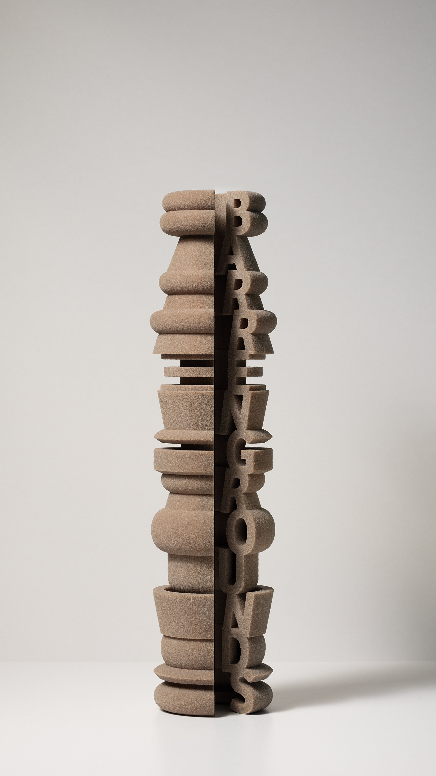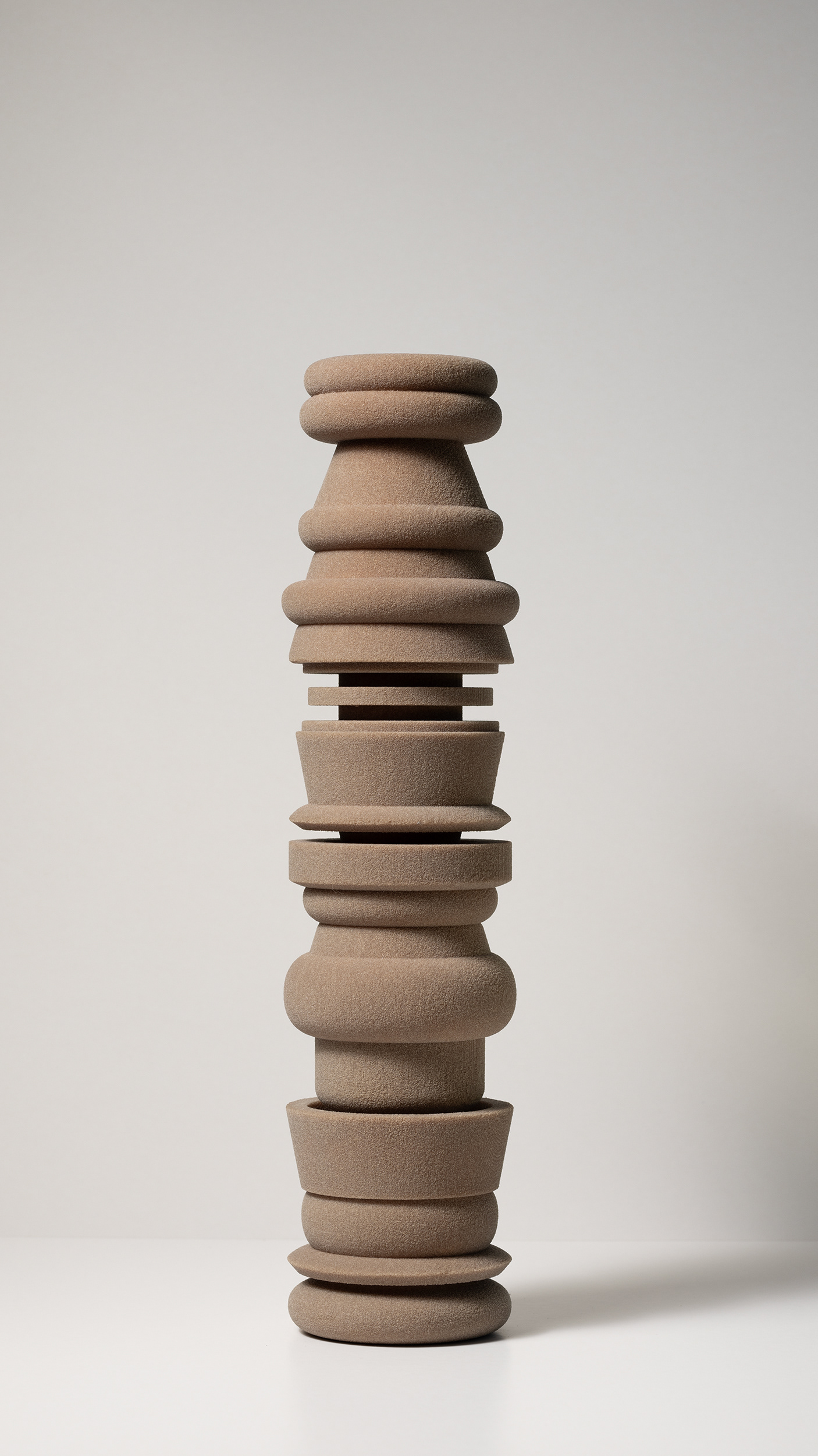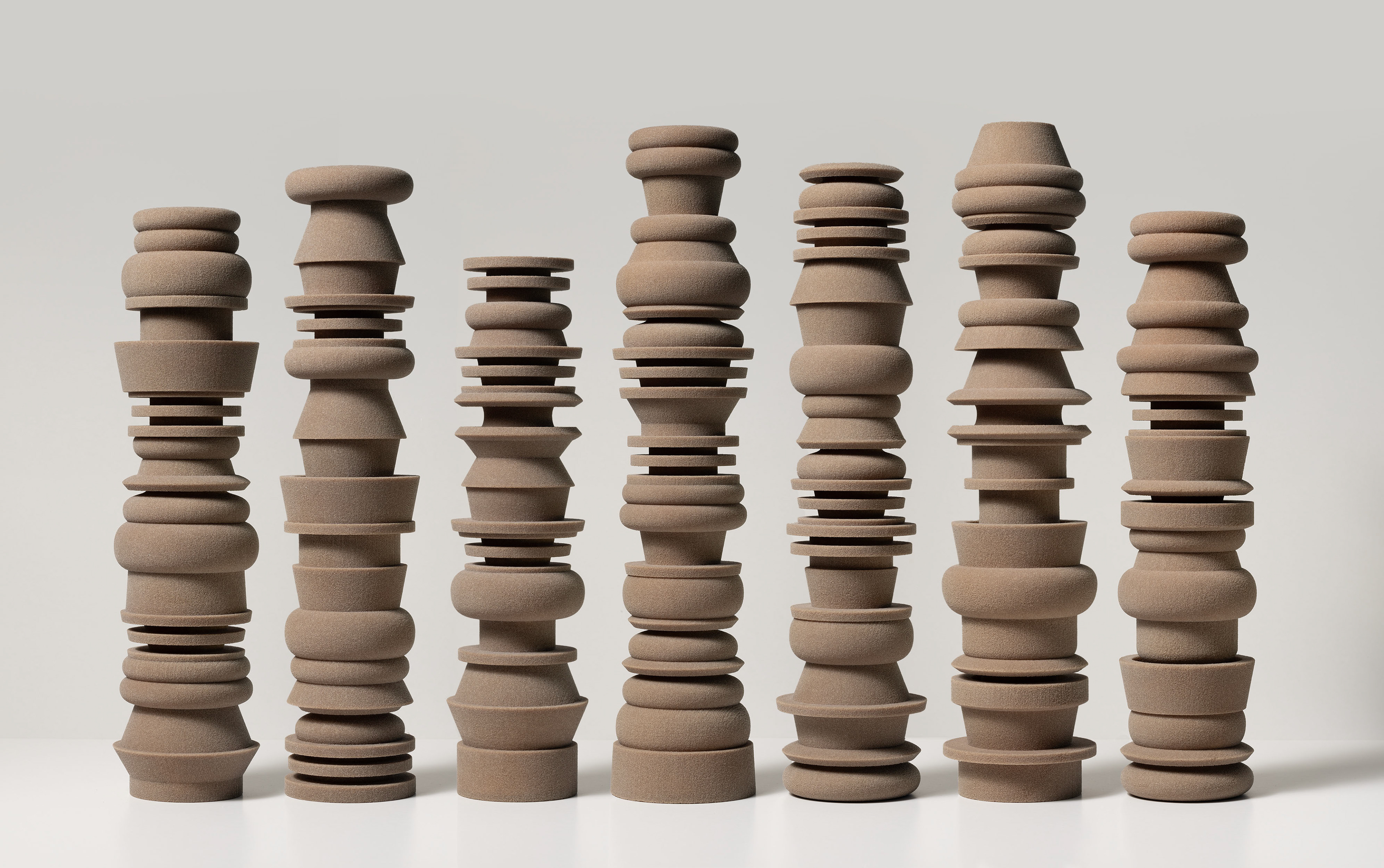 Standing Songs are totems where design and language meet. Rising like modern relics, they echo the forms of totem poles. Anton shapes them in sand; Jenny threads them with words, three at most, small poems etched in form. Visit Exhibitions to see more.